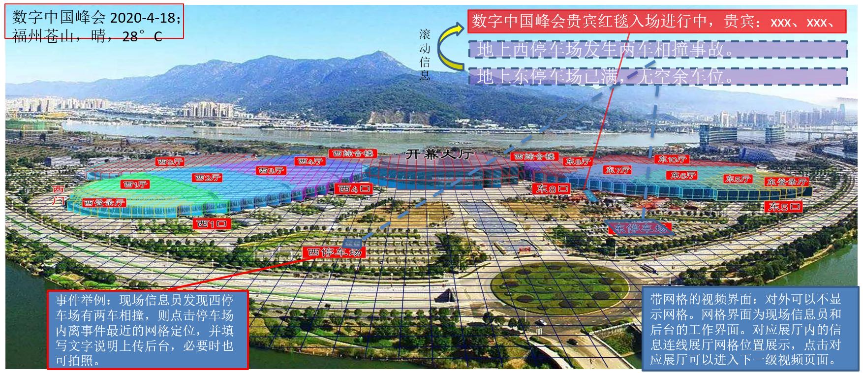 通過(guò)給福州倉(cāng)山海峽會(huì)展中心安裝多個(gè)高位攝像頭,利用北斗網(wǎng)格編碼和三維網(wǎng)格立體建模技術(shù),實(shí)現(xiàn)視頻內(nèi)容空間感知、快速定位、高效管理、多源數(shù)據(jù)協(xié)同分析能力的視頻網(wǎng)格化管理系統(tǒng),滿(mǎn)足跨鏡頭跟蹤、人群趨勢(shì)分析等應(yīng)用需求,從而快速、高效地實(shí)現(xiàn)會(huì)展中心視頻監(jiān)控智能管理、重點(diǎn)區(qū)域安全態(tài)勢(shì)感知及實(shí)時(shí)指揮,提升會(huì)展中心安防管控能力和應(yīng)急事件響應(yīng)能力。